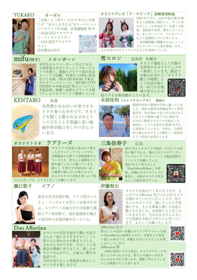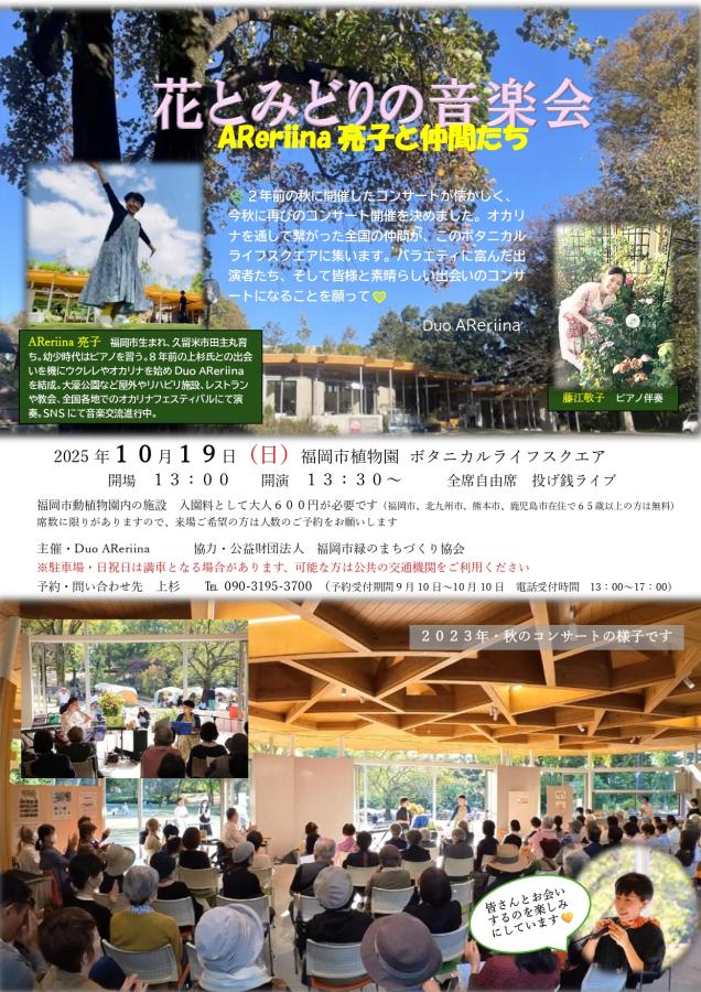 植物園の自然豊かな雰囲気の中で演奏会を行います。(オカリナ、ピアノ、オーボエ、トロンボーン、ケーナ、ウクレレ、歌など)