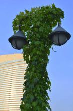 この写真は樋井川の下流にある2階建ての橋・ふれあい橋の側にある街路灯です。街路灯自体が猫の目の様に見えてユーモラスです。