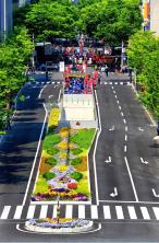 五月の連休全国一の人出を誇る博多どんたく港まつりのパレードの出発を撮ろうと出かけました。あまりの人出の多さに断念し博多駅に行きました。駅ビルに上るとパレードの隊列が地下から地上に上がってくるのが見え、中央分離帯に植え込まれた花壇の光景は、私には一時の清涼剤「オアシス」の様に思われました。