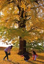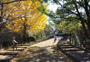 城内経由のバスをよく利用します。車窓からの眺めは四季折々の木々が楽しめます。秋は大きなイチョウの木がまっ黄色になってきれいでした。次の日、太陽が少し西に傾いた時間に黄金色に染まった木の下で戯れている観光客も被写体に入れて撮った一コマです。