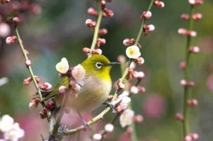我が家のほど近くに、小さな梅林があり、今年は沢山のメジロが飛来しました「春は名のみの風の寒さ」でしたが、早春の陽光の中で撮影しました。メジロは動きが早く、3日通った撮影で合格点の作品は僅かです。この作品は、咲き始めの梅の花の淡いピンクと良い表情のメジロがマッチしてくれました。
