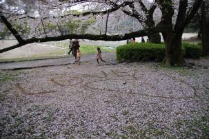 桜が前日の雨で散り、あたり一面が薄いピンク色で覆われている。そこに外国人の女児が大きくハートの形とLOVEの字を書き、無邪気に遊びまわっている様子が目に入ってきた。同じ年頃の孫娘を思いつつシャッターを切りました。