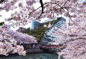 春の陽気に誘われて、散歩中に出会った桜が丁度満開のときを迎えていました。福岡の街の真ん中にある桜並木です。こぼれんばかりに咲いた桜が、無機質になりがちなガラス張りのビルを彩って、にぎやかな街も一層華やいで見えました。