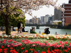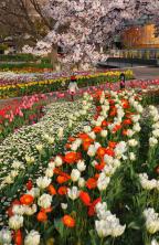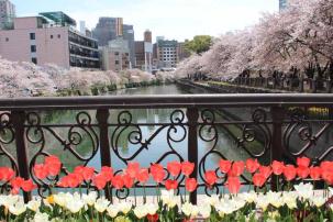 十万本のチューリップロードの催しがあるのをテレビで知り、天気のいい日、博多駅から天神に向かって歩きました。丁度中央公園の近くの橋の上まで来た時、チューリップの花が見事に咲きその後ろには、桜の花が川面に写り、ふたつの花のコラボレーションに一瞬目を奪われてしまいました。