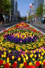 博多駅と天神の間を10万本のチューリップで彩るイベント「福博花しるべ」。写真は「はかた駅前通り」で撮影しました。赤、白、黄色など様々な色や種類のチューリップが沿道に植えられて、いつもとは違う福岡の街が楽しめました。天候もよく、春の日差しが気持ち良いこの季節にピッタリのイベントだと思います。
