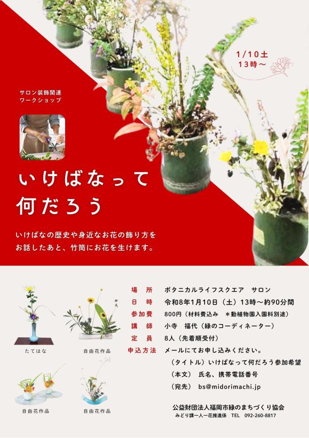 メールにてお申し込みください。 ・メールタイトル/いけばなって何だろう参加希望 ・メール本文/氏名、携帯電話番号 ・メール宛先/bs@midorimachi.jp