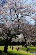 晴天の中桜を大きく入れて撮影して見ました。桜木の下ではグリーンがとてもきれいで子供たちが走り回って遊んでいる所を写して見ました。その中の1枚です。
