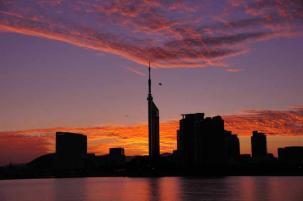 桜の花が満開の舞鶴公園でのライトアップを待つ間、夕日に輝くお濠の美しさに惹かれて撮影しました。