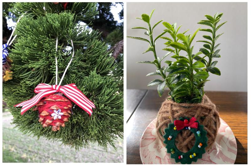 コケ玉にクリスマスっぽい装飾をして、ちょっと変わったオリジナルのコケ玉つくりです。