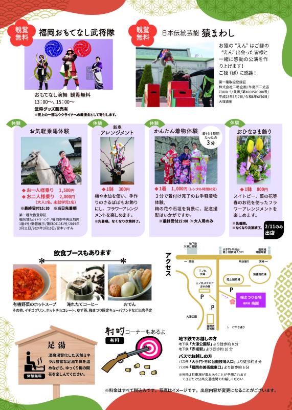 【日時】令和6年2月10日(土)、11日(日) 午前10時~午後4時 【場所】舞鶴公園 梅園 【出店予定】 「福岡おもてなし武将隊」 演舞13:00~,15:00~ 観覧無料 写真撮影あり グッズ販売 缶バッチセット500円 黒田親子生写真セット3種500円 マフラータオル3,000円 オリジナルトートバッグ1,200円 黒田家家紋入りマスク1,000円 「お気軽乗馬体験」 お一人様乗り1,500円 お二人様乗り2,000円(大人一名、未就学児1名) ※当日先着順 最終受付15:30 「猿まわし」 随時上演 「お手軽和装体験」 ①羽織るだけの着物ジャケットレンタル 30分 500円 ②3分かんたん着物 60分 1,000円(3分で着付けができるお手軽体験) ※いずれも当日先着順 「植物を使ったワークショップ」 ①新春アレンジメント 1鉢300円 梅や水仙を使ったアレンジメント体験 ※当日先着順 ②おひな様飾り 1鉢800円 スイトピー、菜の花を使ったフラワーアレンジメント ※先着順 2/11のみ出店 「飲食」 ①ブース出展 ホットコーヒー、有機野菜のホットスープなど ②キッチンカー出店 甘酒、おでんなど |