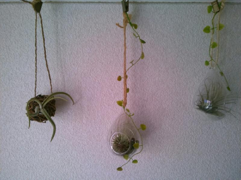 ガラスの器(2作品)と、つるで作ったボール(1作品)に、エアープランツをアレンジした3作品の室内飾りを作ります。