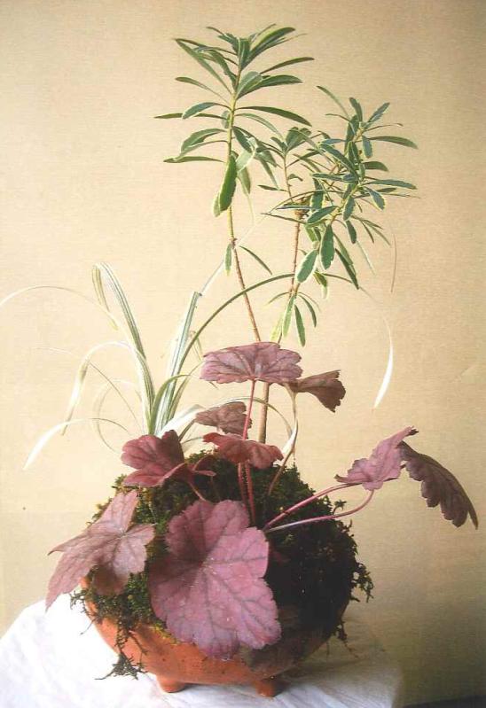 ジンチョウゲなどの花木を使って、直径15㎝程度の寄せ植え盆栽を作ります。