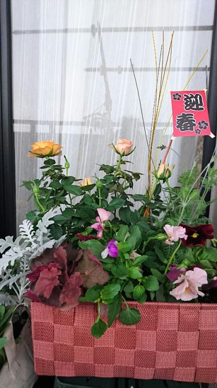 ミニバラやハボタンを使って、寄せ植えコンテナを作ります。