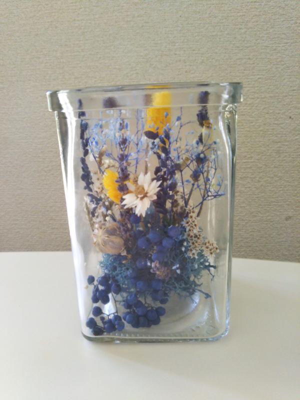 プリザーブドフラワー、ドライフラワーなどのブルー系のナチュラルな花材を使って、ガラスの器の中にお花畑をイメージして飾ります。