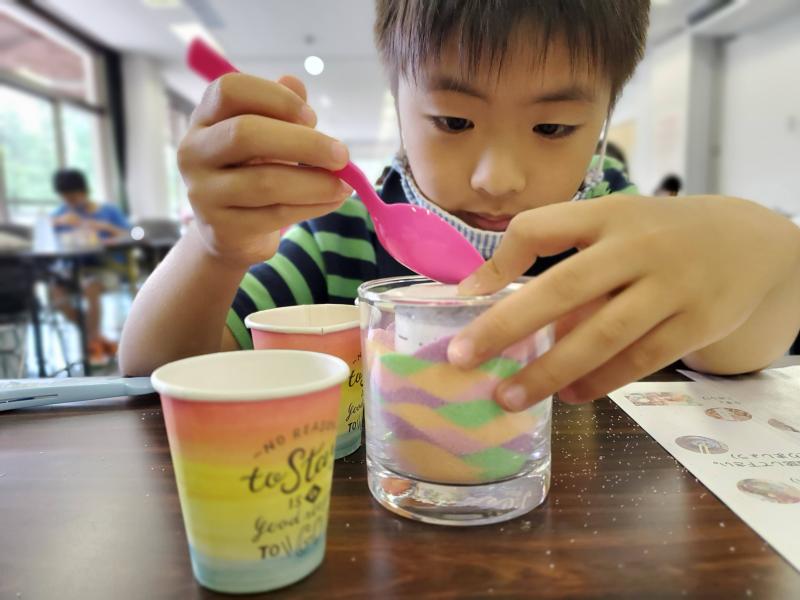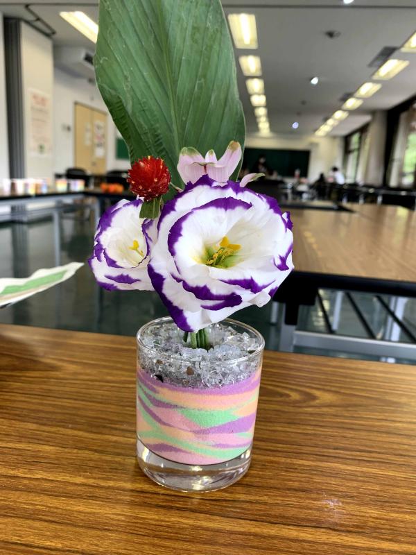 色付き砂を重ねて入れて、一輪挿しを作ります。