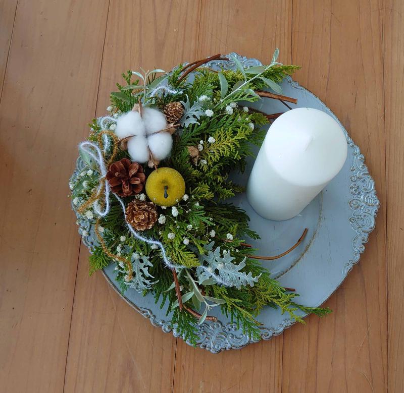 ドライフラワーになる生花のエバーグリーン等の花材を使って、クレセント(三日月)形のアレンジメントを制作します。
