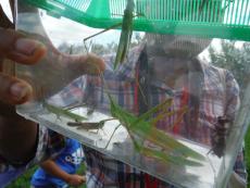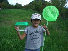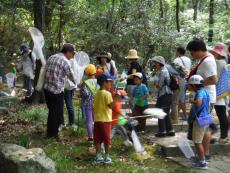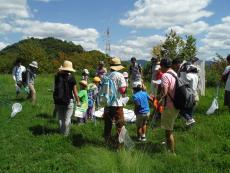 東平尾公園レベルファイブスタジアムから出発し、陸上競技場「見晴らしの丘」へ昆虫採集に出かけました。残念ながらカブトムシやクワガタ等の甲虫類は時期的に観察できなかったのですが、見晴らしの丘では、参加者みんなでバッタの「追い込み漁」をしました。たくさんの種類のバッタや、カマキリ、コオロギなどが観察できて、参加した皆さんもとても楽しんでいただいたご様子でした。