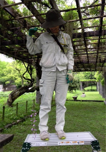 夏は花芽となる枝に日光を当てるため、重なった枝葉を切除して徒長したツルの剪定を行います。