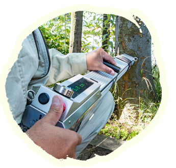 樹木のようすを撮影。樹皮に開いた穴の大きさを