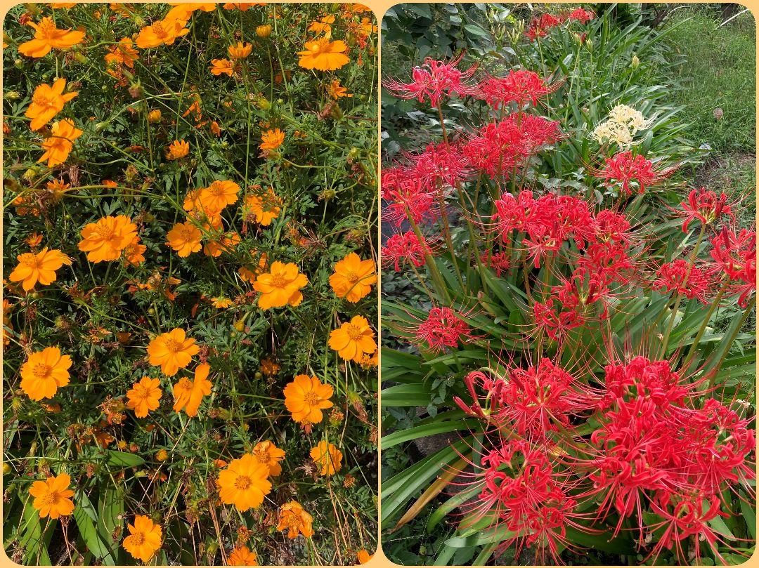 2025/09/25撮影。舞鶴公園 三の丸スクエアの花壇にキバナコスモスがほぼ満開です。所謂コスモス(オオハルシャギク)とは同属別種とか。赤と白のリコリス(彼岸花)も楽しめます。