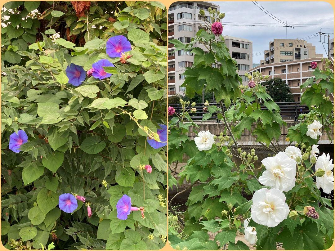 樋井川 草香江橋辺り(鳥飼9号線) 酔芙蓉と琉球朝顔