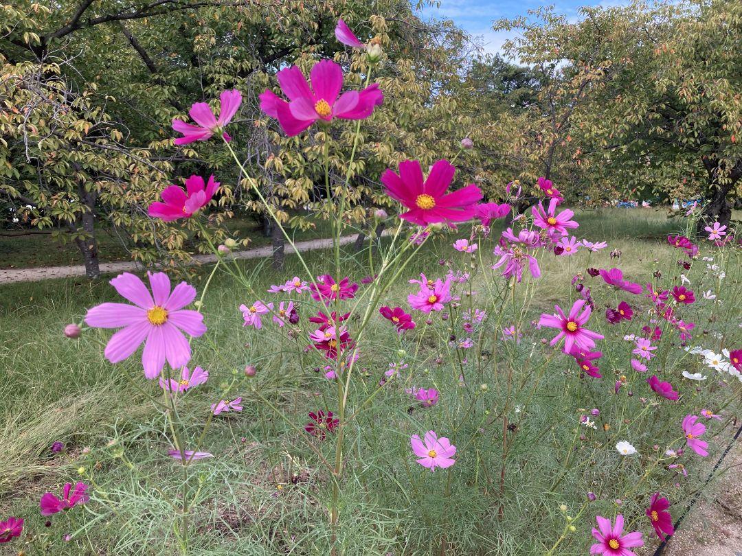 2025/10/15撮影。舞鶴公園三の丸広場の西側に赤白ピンクのコスモスが咲いています。