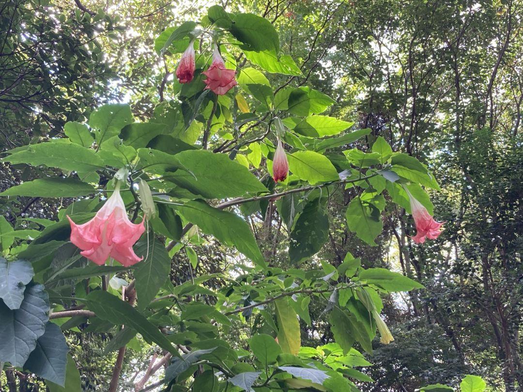 2025/10/15撮影。掘出稲荷神社(福岡縣護國神社境内末社)辺りにキダチチョウセンアサガオ(エンジェルストランペット)が大きなピンクの花を付けています。