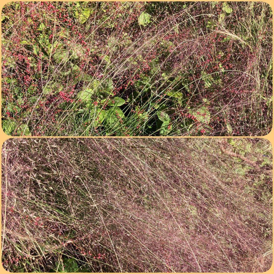 2025/10/17撮影。福岡市植物園の芝生広場の花壇には、赤い小さな花を付けたミズヒキと薄赤紫のスモークのようなミューレンベルギア・カピラリスが咲いています。