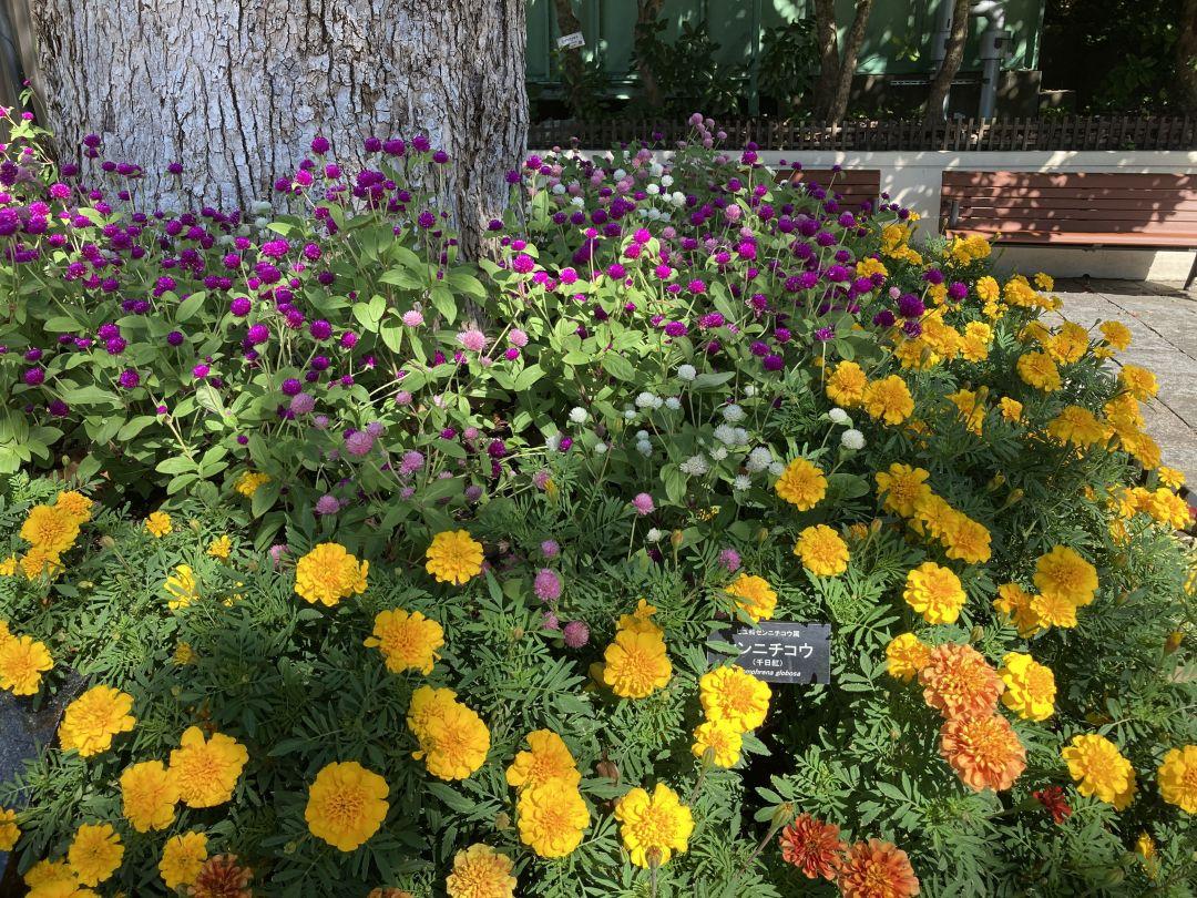 2025/10/17撮影。福岡市植物園入口前にマリーゴールドと赤白ピンクのセンニチコウが咲いています。