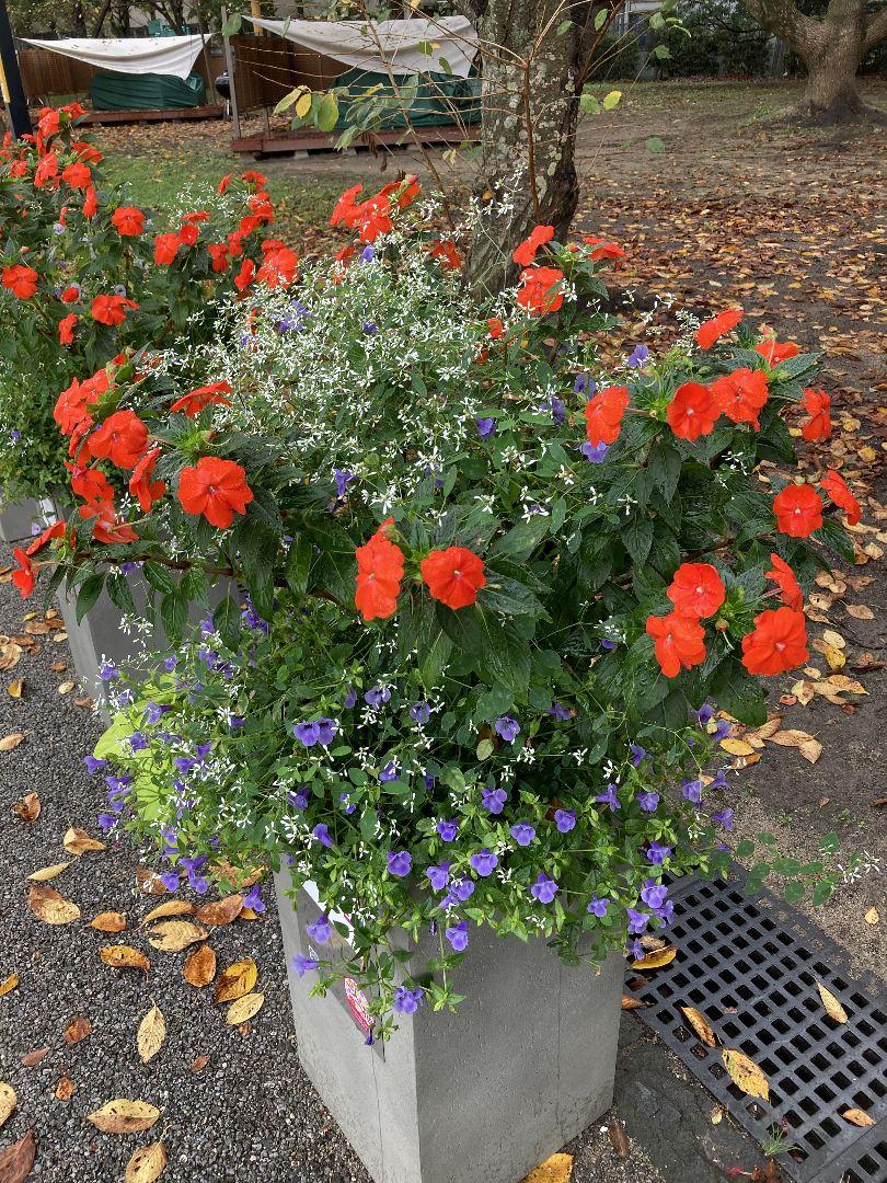 2025/10/18撮影。舞鶴公園三の丸広場大通路のBBQガーデン側に企業協賛の寄植プランター20基が設置されています。現在、真紅のインパチェンス、紫のトレニア、白いユーフォルビアが咲いています。