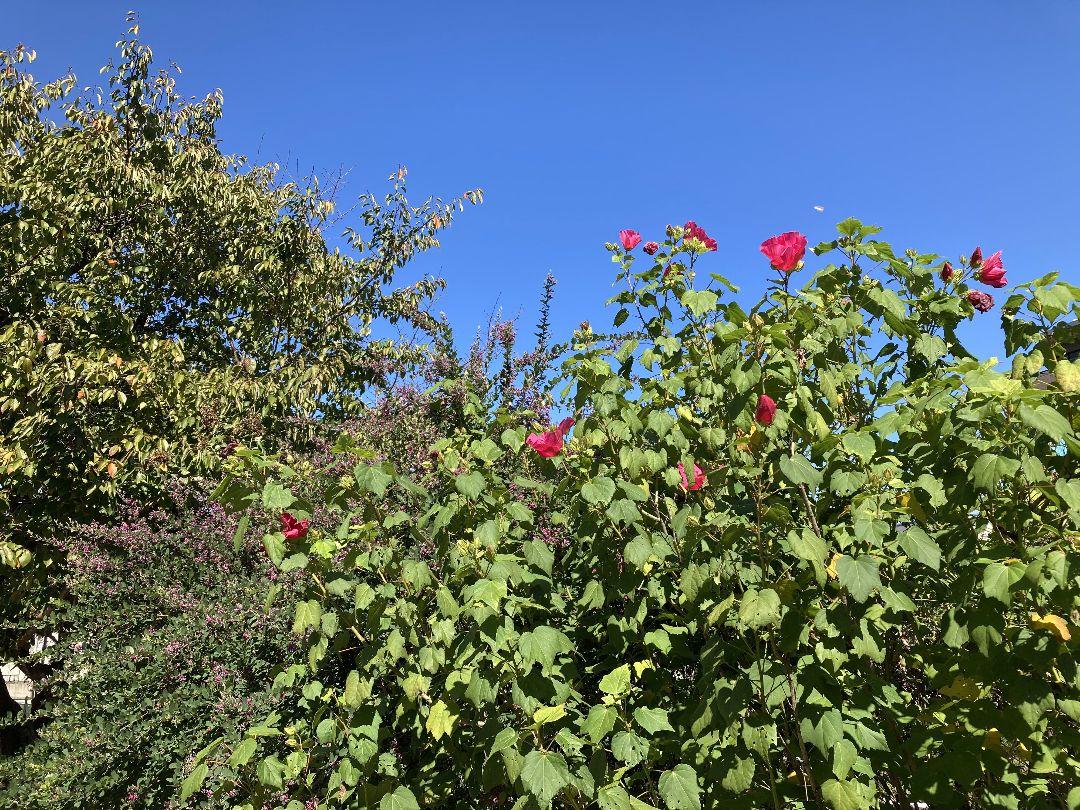 2025/10/27撮影。下長尾北公園。真っ赤な芙蓉と萩が青空バックに映えてました。以前ここの花壇で葉牡丹を見かけたのですがありませんでした。