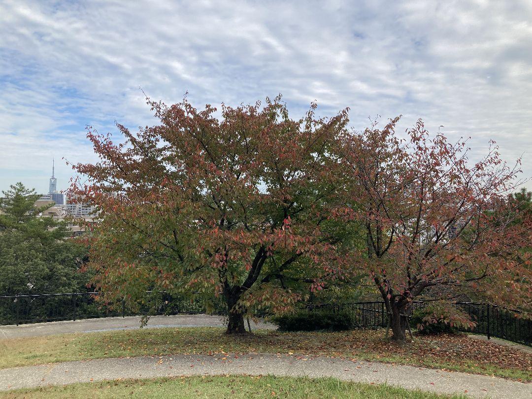 2025/11/05撮影。祖原公園全体の紅葉はこれからですが頂上広場の福岡タワーを望む辺りの桜はかなり色づいてます。