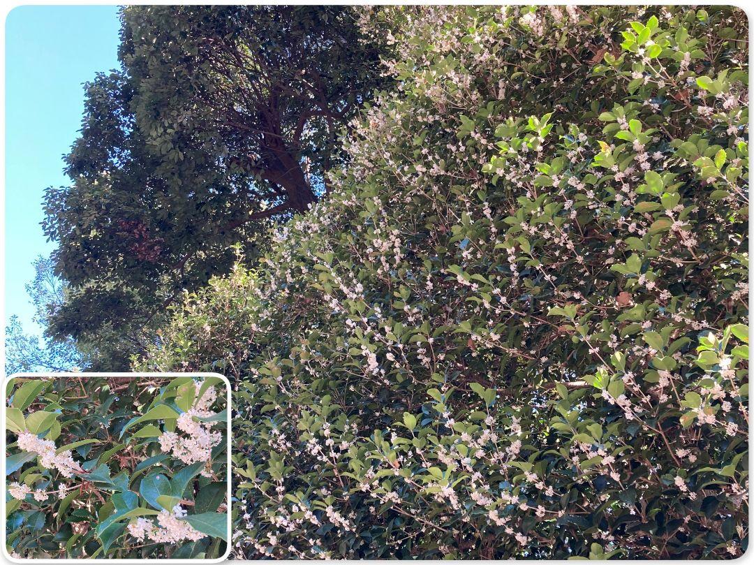2025/11/08撮影。福岡縣護国神社の大鳥居から入った左手辺りで、微かに金木犀の匂い?と見回すと背が高い銀木犀で白い花がほぼ満開。目立たないので見逃してました。