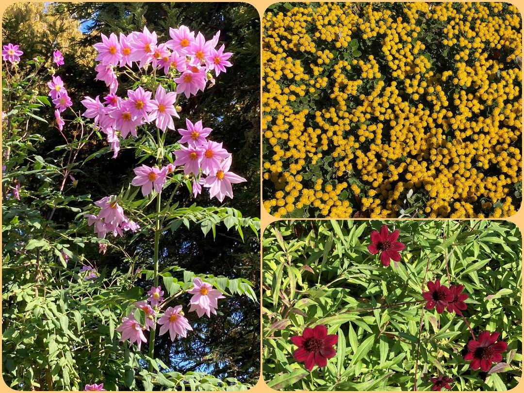 2025/11/23撮影。福岡市植物園の入口広場から針葉樹園に入る辺りに小さな黄色い花をつけたイソギク、色も匂いもチョコレートのチョコレートコスモス、大きななピンクを花を沢山付けた皇帝ダリアが見頃です。