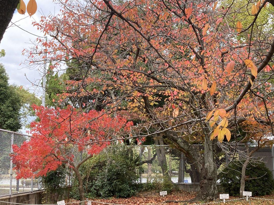 2025/11/28撮影。福岡管区気象台の桜とモミジの標準木です。両方とも綺麗に紅葉しています。ここは落ち葉を除かないようでそれもまた綺麗ですが、数年前から入れないのが残念。