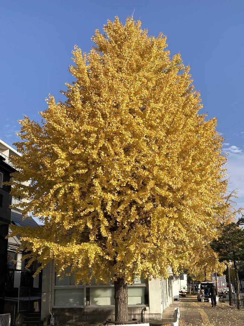 2025/12/01撮影。梅光園緑道最南端の更に先の大きなイチョウの木が見事に黄葉しています。