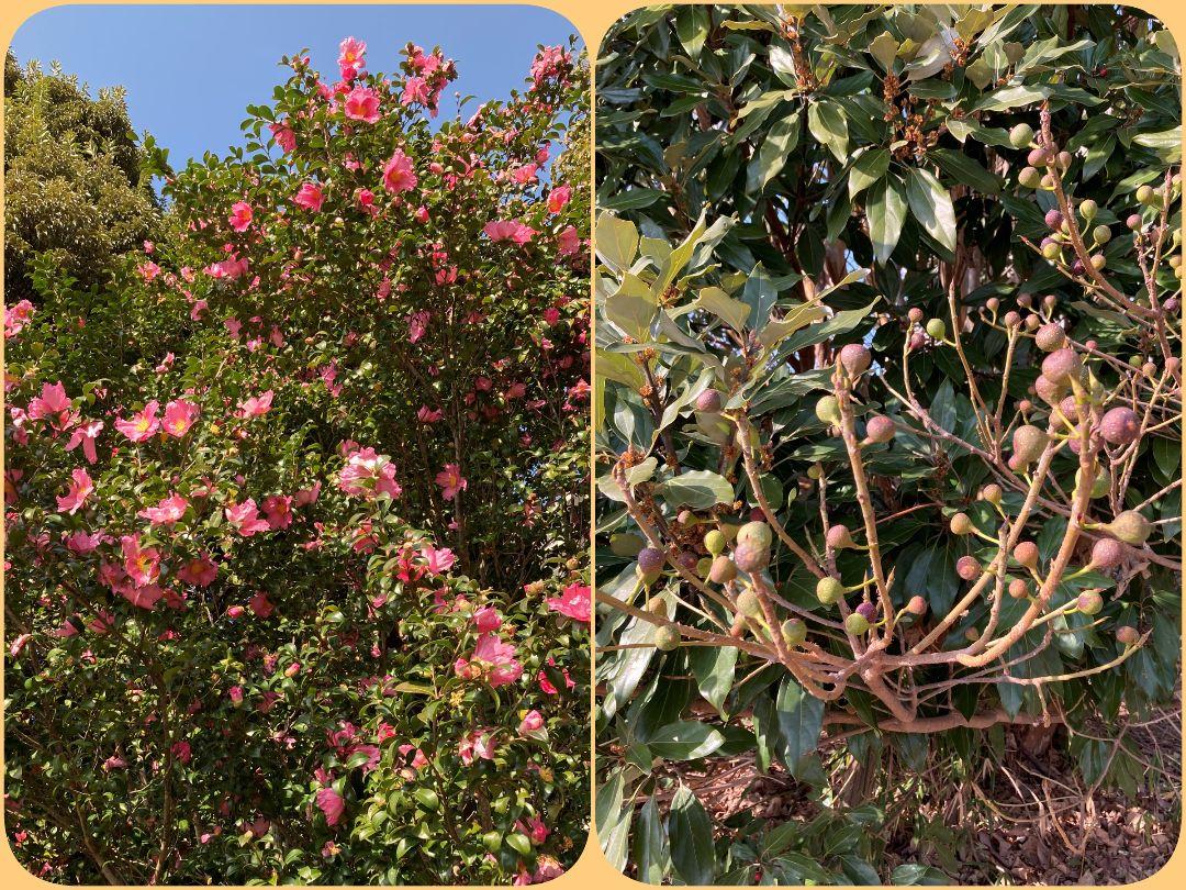 2026/01/19撮影。小笹中央公園の一番高い広場北側にこの辺りでは珍しいピンクの山茶花が満開でした。広場北西では犬琵琶が沢山実をつけています。