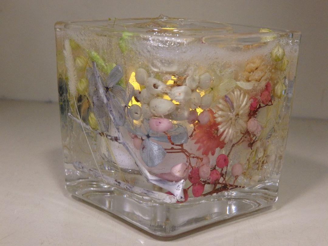ドライフラワーや木の実をゼリーに閉じ込めた、キャンドルホルダーを作りました。