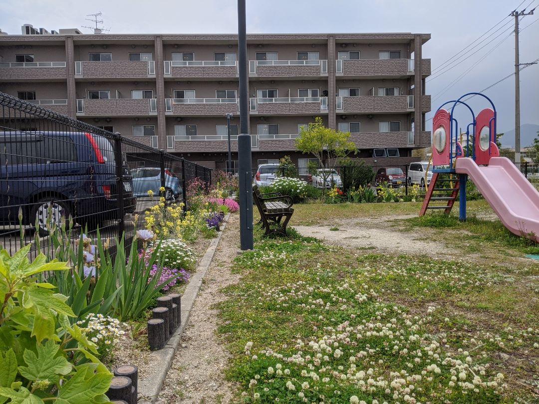 公園のまわりを色々な種類の花たちが取り囲んでいます。