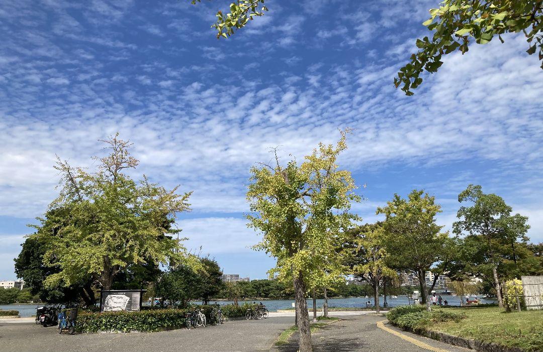 2022/09/24撮影。美術館近くのイチョウの木。未だ葉は緑ですが、銀杏の実が落ち始めています。