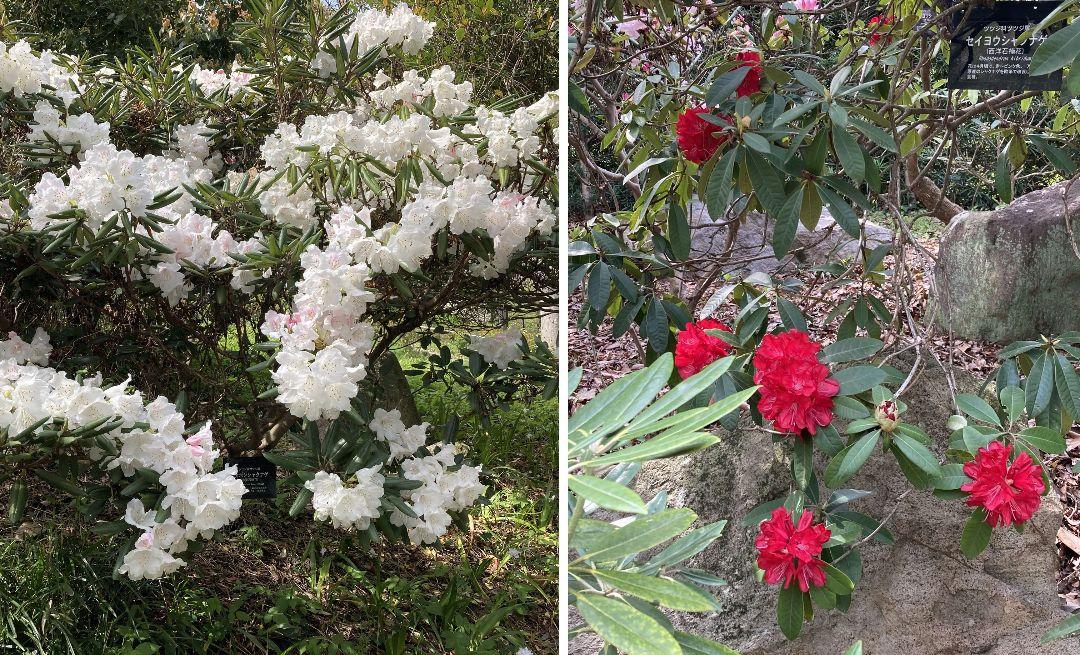 2023/03/30撮影。バラ園の裏(北側通路)に、白い赤星シャクナゲと真っ赤な西洋シャクナゲが咲いてます。赤星シャクナゲは蕾の頃はピンクで開花すると真っ白に見えます。