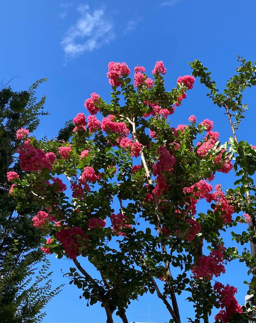 2023/08/02撮影。猛暑日で日差しが強い中、ピンクの百日紅がモコモコと花をつけています。お昼前のこの時間帯は、青空によく映えていました。午後からは、1時間ほど急に暗くなりゲリラ豪雨が通り過ぎて行きました。