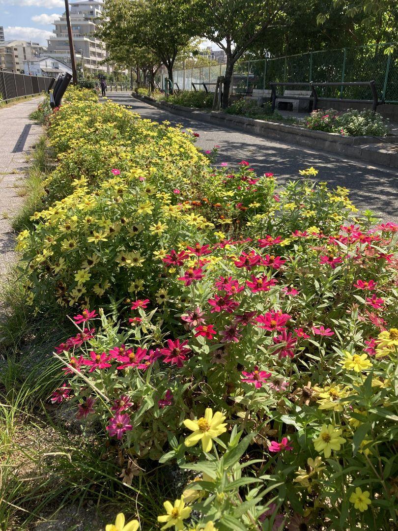 2023/10/12撮影。樋井川リバーサイドの花壇に赤や黄色の百日草が沢山咲いています。奥(南)の方には千日紅も咲いています。蝶々もあちこちで吸蜜してます。