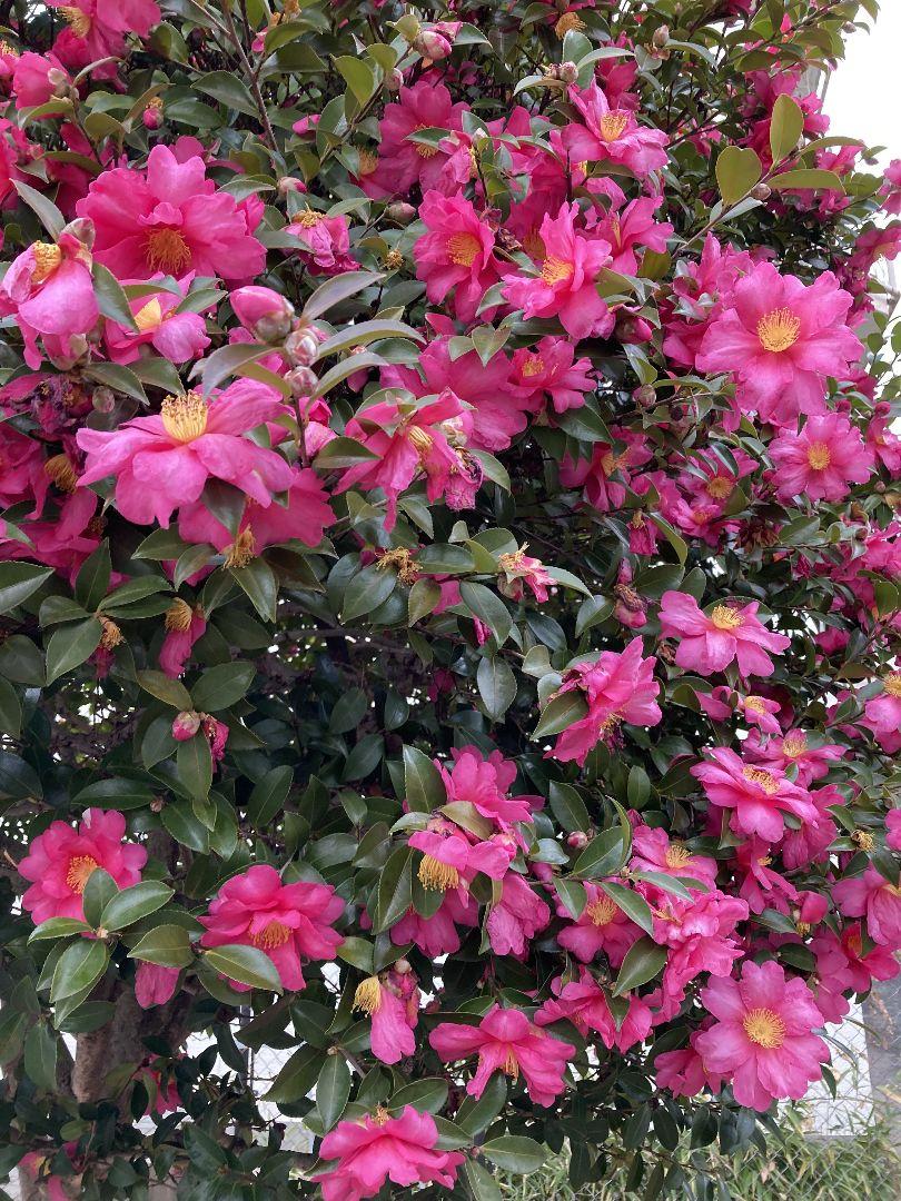 2024/01/07撮影。緑道の真中あたりの山茶花がこれ以上隙間ないほど咲いてます。既にピークは過ぎていて根元辺りは赤い花弁が沢山落ちています。