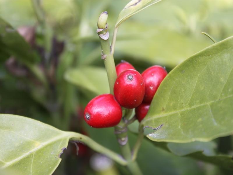 福岡市の公園では林の中や木陰で見かけます。冬、濃い緑の葉のかげに赤い実がよく目立ちます。