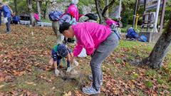 秋晴れの11月1日午後、ロータリー2700地区第5グループの皆様が、ロータリー奉仕デーの活動として、舞鶴公園藤園の藤および桜に肥料をあげる作業をしてくださいました。 そのタイトルは「樹を育て、人を育てよう! ~舞鶴公園の桜と藤への施肥事業~」 日本ボーイスカウト福岡県連盟の子どもたちも参加してくださり、総勢約180名でのにぎやかな作業でした。 「樹に肥料をあげる」というと、少し難しそうなイメージがありますが、念入りな準備とわかりやすい説明のおかげで、子どもたちも楽しく、張り切って作業に取り掛かってくれました。