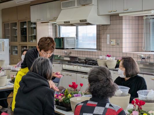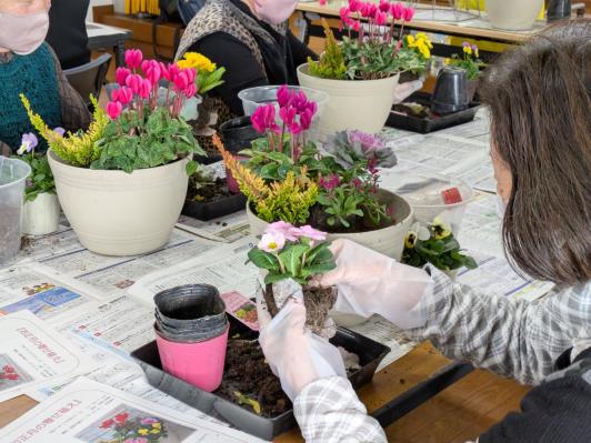 玄界島の皆さんは、寄せ植え講座が大好きだそう。