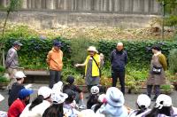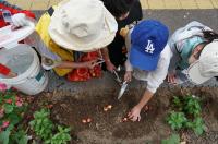 まずは、会長の山野さんから植え方のレクチャーです。 ・苗はさかさまにして優しくポットから出し、下を少しほぐしましょう ・チューリップはぷっくりした方を手前に、深さ10センチくらいで植えよう などの植え方のコツを習ったら、忘れないうちにいざ実践!